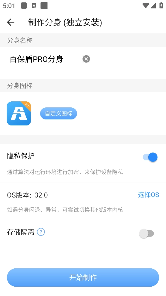 您需要先设定分身的标识名称与对应的图标样式,接着从系统版本列表中挑选适配的选项。当前可搭配使用的辅助功能模块数量不多,主要涵盖了设备型号模拟、位置信息虚拟以及分身访问权限锁定这几项功能。
