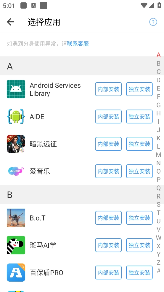 在界面上找到并点击那个带加号的按钮后,系统会自动列出你设备中已安装的各类应用程序。此时,你只需通过字母索引快速定位到目标应用,点击它就能完成对应应用分身的创建操作。
