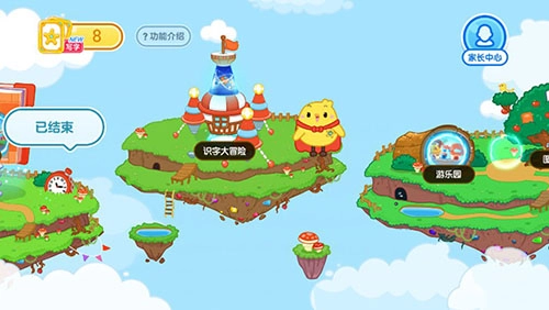 在本站完成软件安装并进入软件首页后,首页呈现出如图所示的界面,其中涵盖了识字大冒险、游乐园、图书馆等丰富多样的识字板块。