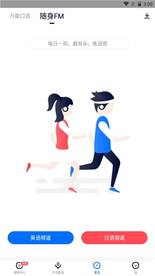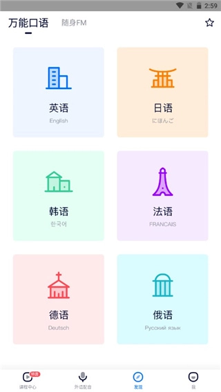 在发现页面里,能找到可供学习的万能口语内容,涵盖旅游、面试、交流等各类场景。