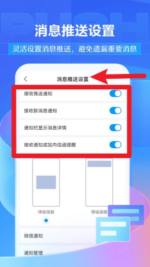3、在“消息推送设置”中可灵活开启或关闭多种通知选项,避免遗漏平台重要信息提醒。