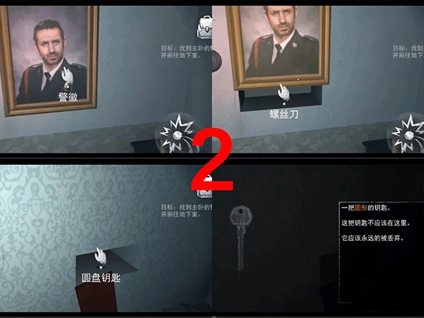 沿着楼梯向上走到二楼,一直走到走廊尽头稍作停留,右手边的房间门后藏着一个小秘密——墙上挂着一幅身着制服的人物照片,靠近它就能拿到一枚金属徽章。再次触碰这幅照片,会发现一个隐藏的小格子,里面放着一把细长的工具。之后回到一楼,穿过客厅走到厨房区域,在靠近楼梯的那面墙下方,有个不起眼的暗格,用刚才找到的工具撬开,就能取出一把金属钥匙。