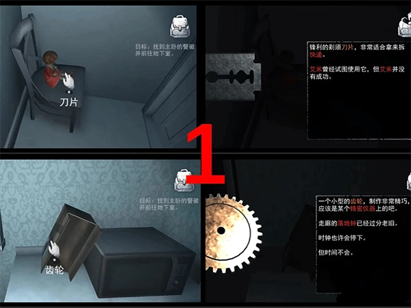 从出生点出来后走向楼梯口,选择左边的路径。在楼梯附近有一扇门,这扇门通向地下室,打开门后可以在板凳上找到刀片。之后回到楼梯口往右边走,右手边会看到一张桌子,桌上放着一个纸盒,用刚才拿到的刀片割开纸盒就能得到齿轮。