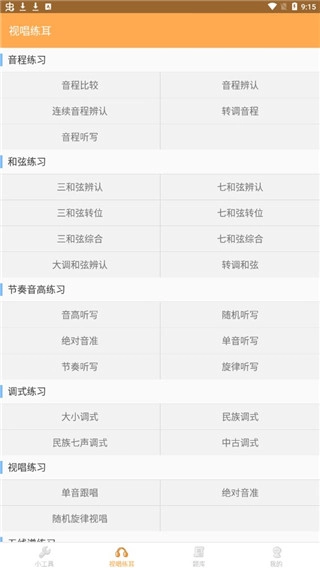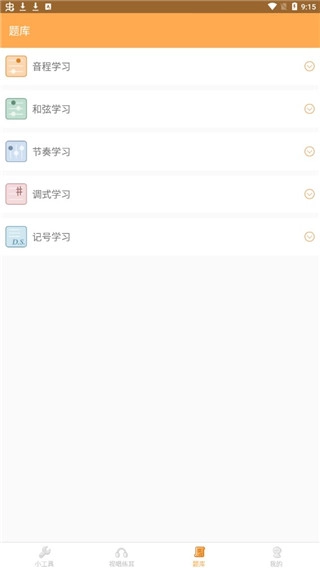 点击题库后,里面包含音程学习、和弦学习、调式学习、记号学习等内容,这些都是最基础的课程学习板块,大家可以依据自身不同的水平来选择操作。