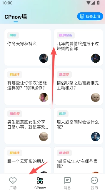萌点CPnow的专属上墙板块,和校园墙类似,这里也有不少有趣的用户分享内容,像闲聊话题、情感倾诉之类的都能看到。