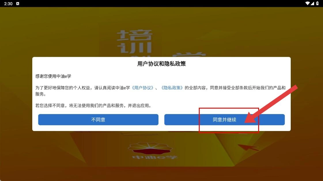 点击【同意并继续】功能按钮,以确认接受用户协议与隐私政策。