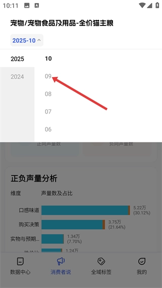 切换月份后,能够查看该月的【正负声量分析】与【评论原文】,以便更深入地了解消费者针对全价猫主粮的反馈情况。