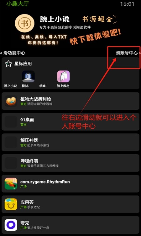 1、在本站下载安装小趣商店、然后打开软件进入首页,往右边滑动进入账号中心
