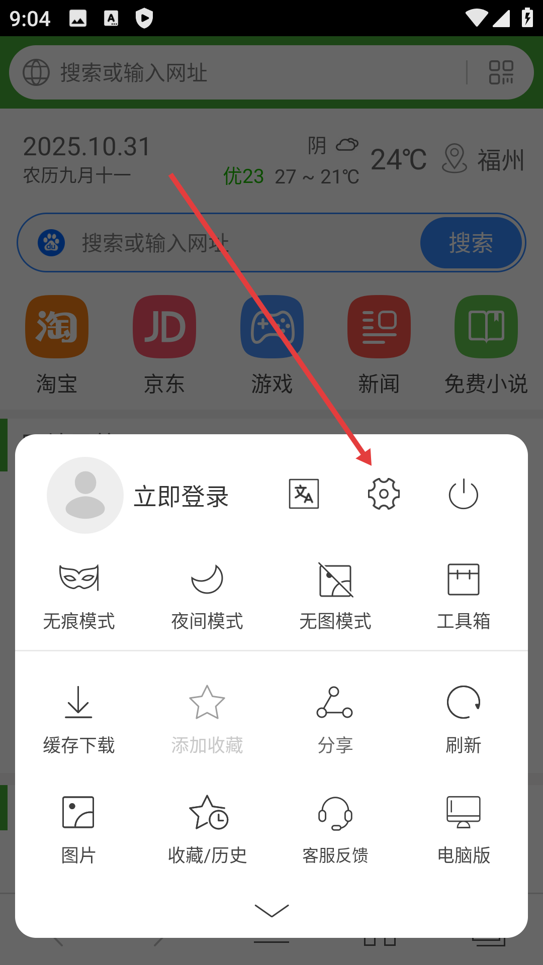 在浏览器界面点击底部菜单按钮,展开功能菜单。