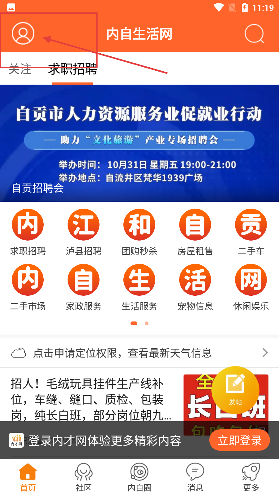 打开【内自生活网】后,点击左上角的个人图标,进入个人中心页面,以便进行后续操作。