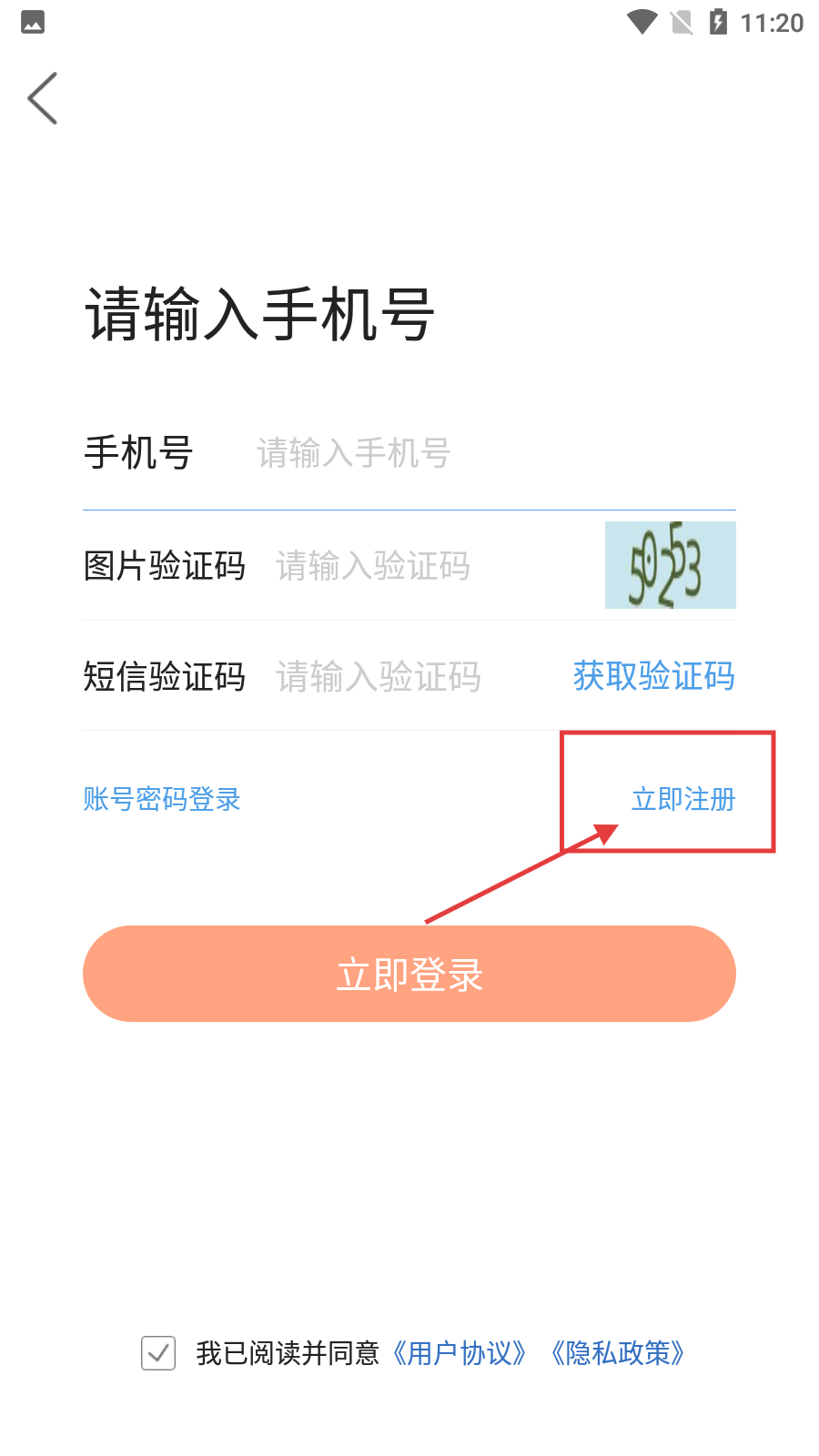进入登录页面后,填写手机号和图片验证码,点击【获取验证码】按钮并输入收到的短信验证码即可完成登录;若还未注册账号,也可以选择点击【立即注册】按钮进行账号注册。