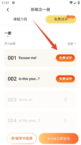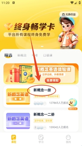 我们打开软件后,先定位到自己计划学习的课程,就像我此刻要学习“新概念一册”一样。