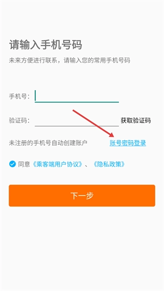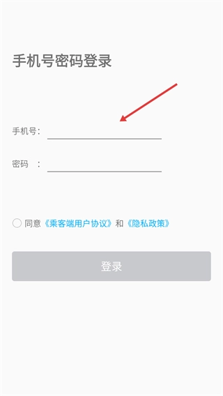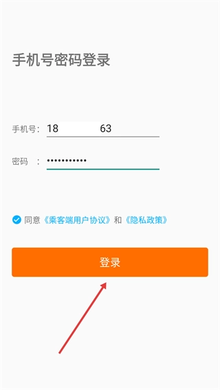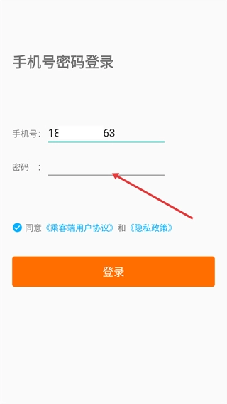 在密码输入框中填写账号对应的密码,并勾选【同意《乘客端用户协议》与《隐私政策》】这一选项。