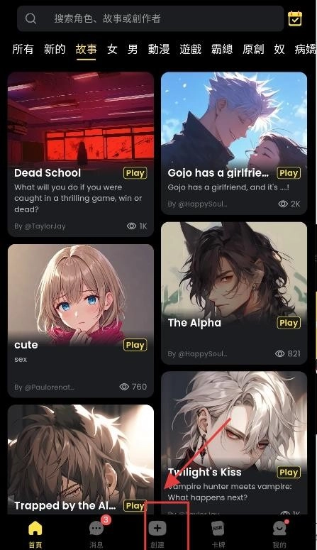首页提供了丰富多样的角色与故事供用户挑选,包含动漫、游戏、霸总等多种风格,能够满足不同用户的兴趣偏好。