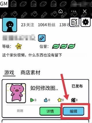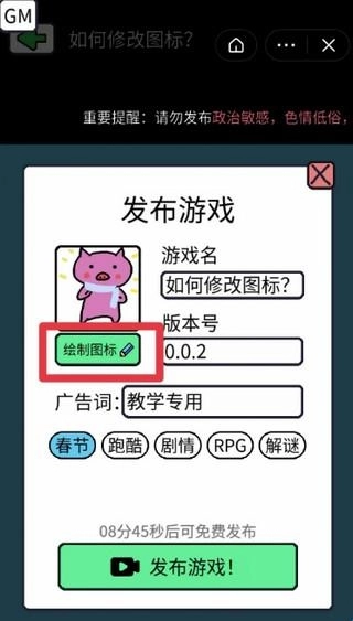 进入编辑界面后,先按步骤1选择“发布游戏”,再按步骤2选择“绘制图标”,就能直接在原来的图标上进行修改操作啦。天气转凉,我给小猪添了条围脖,嘿嘿,你看,是不是挺容易的?