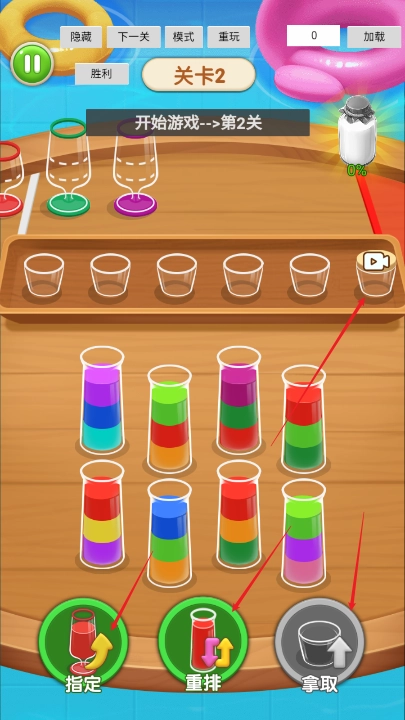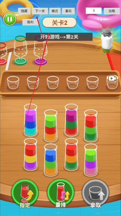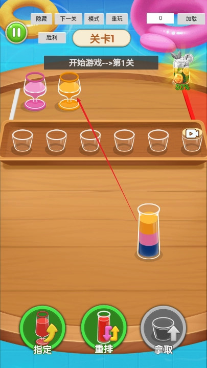 用户需要通过操作不同的试管,把颜色一致的液体倒入对应的杯子里,每个关卡的液体颜色和试管编号都会发生变化。