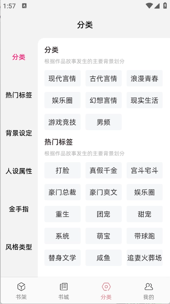 “分类”页面,对小说进行了细致的分类,涵盖言情、科幻和悬疑等类别。