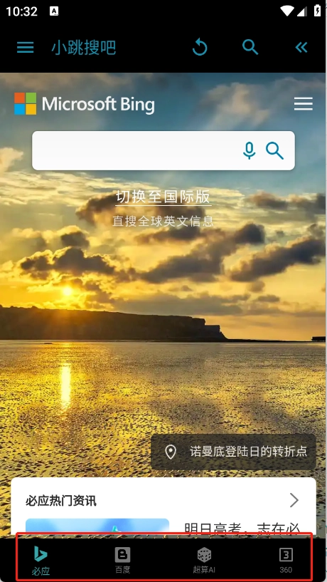 进入首页后,顶部栏包含必应、百度和360搜索等选项,直接点击所需的搜索引擎即可。