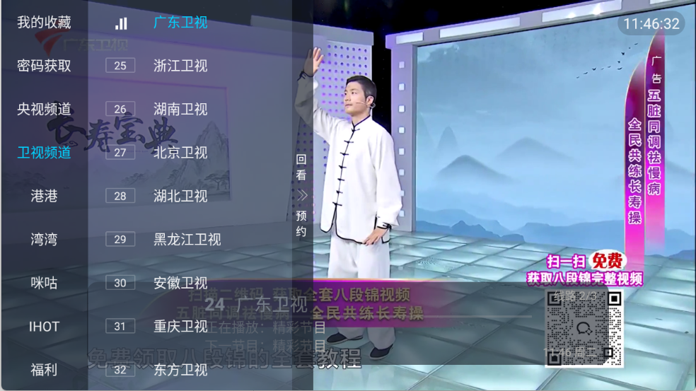 进入后点击屏幕任意一处,左侧栏便会显示众多电视频道。