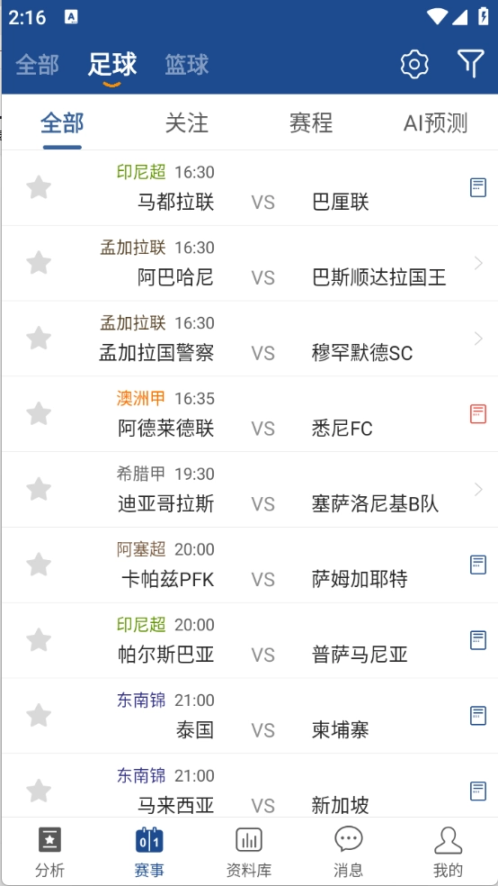 赛事栏目涵盖了当下所有赛事,像足球、篮球这类项目都包含在内,同时还能浏览比分详情、AI预测等相关板块。