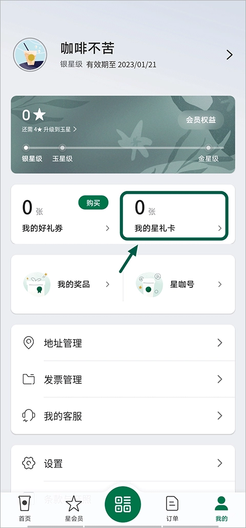 首先打开星巴克应用,进入“我的”页面后,找到并选择“我的星礼卡”选项。