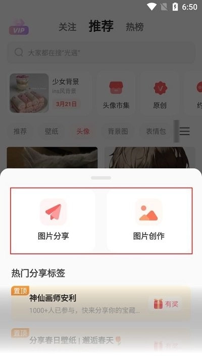 2、在首页顶部拥有关注、推荐、热榜等功能,中部导航栏有推荐、壁纸、头像、背景图、表情包等内容