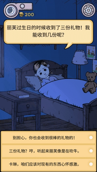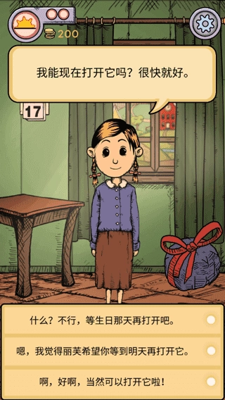 卡琳希望打开礼物再睡觉,可以选择第二个选项