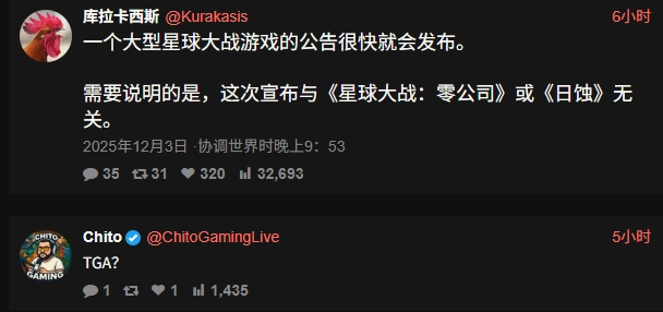 他提到,接下来要公布的内容和《星球大战:零号连队》《星球大战:日蚀》都没有关系,是另一款还没对外公开的作品。一些玩家猜测,这说不定是Respawn Entertainment负责开发的《星球大战绝地》系列第三部(也就是“三部曲的收官之作”),而且正式的公布消息有可能会在即将举办的TGA上发布。