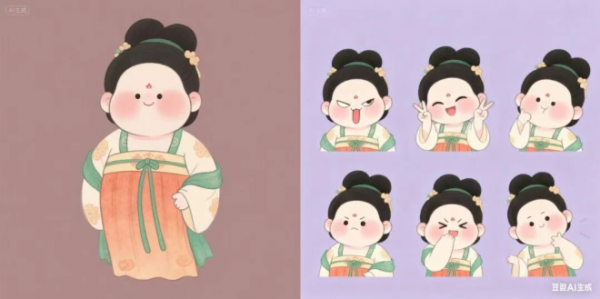 我们还可以制作表情包,Seedream4.0忠实还原了仕女的服饰与造型特色,并充分发挥想象力,生成扮鬼脸、打哈欠、比耶、愤怒等多款生动表情,角色形象和画风均没有走样。