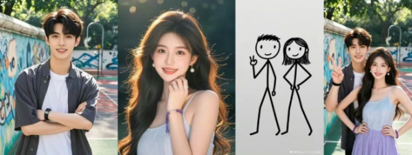 比如基于多图融合能力,上传两张角色照片,再加上火柴人自拍动作,即可实现同框合影。