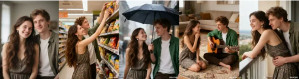 Seedream4.0能够在严格遵循人物外观一致性的基础上,设计出超市购物、雨中撑伞等浪漫场景。这种输出方式避免了传统生成模型常见的形象漂移问题,让用户得到一整套故事化的图像。