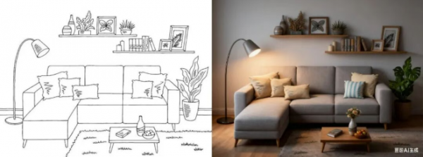 我们上传了一张室内设计的线稿图,并要求将其改造成真实场景。模型实现了细节上的高度还原,从沙发、桌子、台灯等主要家具,到画框、绿植等小型装饰,都能做到几乎1:1的精准复刻。