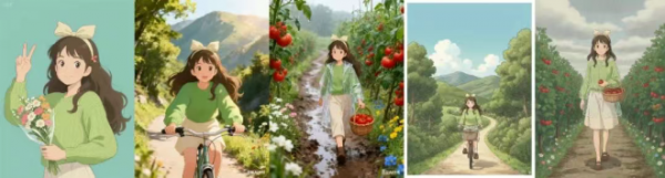 图1为原图;图2、图3为Seedream4.0生成效果;图4、图5为NanoBanana生成效果。提示词:参考这张图的画风和人物形象,生成一组治愈系漫画:1.骑着自行车在山间小路上行驶;2.穿着透明雨衣,雨衣表面有水珠,右手提着装满鲜红番茄的柳条篮子,行走在泥泞乡间小路,小路两侧是繁茂番茄田(红番茄挂藤,绿叶带雨),田边点缀白/粉/黄/蓝野花,细雨纷飞