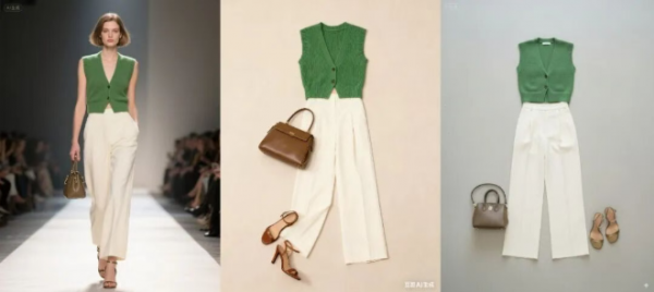 这两款模型都能够严格遵循提示词要求,将参考穿搭准确替换到身上,整体效果自然,服装细节和轮廓基本与参考图一致。