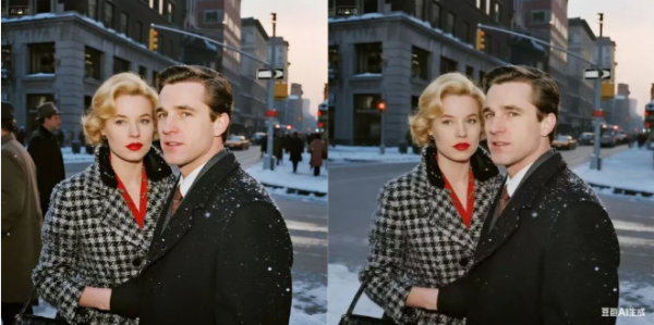 二者实力几乎不相上下,Seedream4.0的成片更清晰,人物面部轮廓与背景纹理表现得更加锐利;NanoBanana的颗粒感更强,也更有老照片的味道。