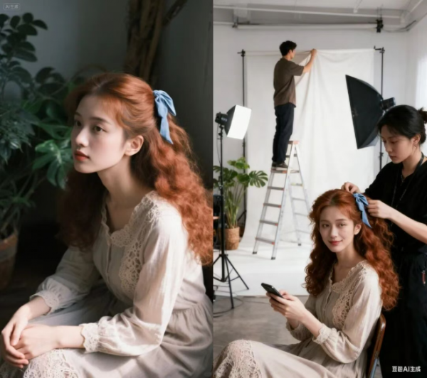提示词:展示布景搭建的场景,坐着滑手机,身后有一位女性正在帮她整理头发,背景里有一名男子站在梯子上挂幕布,幕布后露出摄影棚的环境