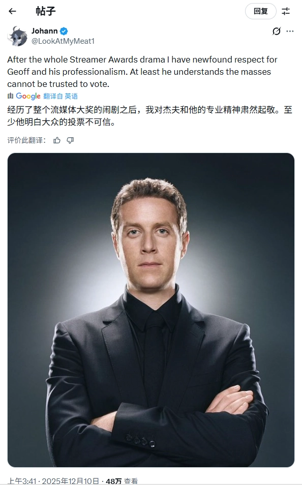 近日,博主@LookAtMyMeat1在社交平台X发布内容称,在经历了主播大奖的整个争议事件后,他对杰夫及其职业态度产生了新的尊重。至少杰夫清楚,大众的投票并非完全值得信赖。