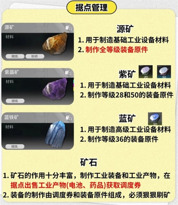 装备制作需要“调度券+装备原件”,矿石为基础原料,是必须大量刷取的资源。