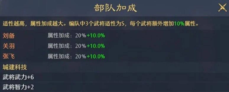 阵容搭配上面也有讲究,同阵营的武将组队能有10%的属性加成,虽然看着不多但积少成多。所以前期选武将的时候尽量往同兵种方向凑,最好能凑出3个S级适配度的阵容,这样属性加成就能拉满。每个武将达到S适配度都会额外增加10%属性,三个加起来提升就很明显了,配合兵种克制关系,伤害输出能高出不少。