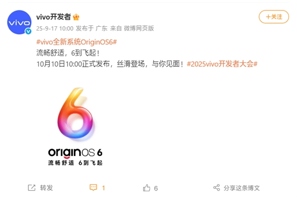 9月17日消息,vivo官方今天发文宣布,全新一代系统OriginOS6将于10月10日10:00正式发布。
