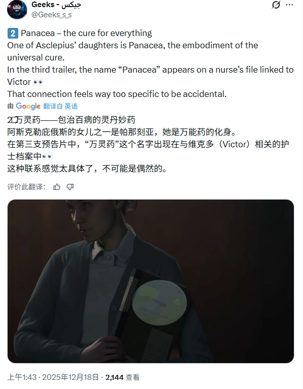 第二点,在第三支预告片中,一名护士档案上出现了“万能药(Panacea)”这一名字,并且与维克多·基甸有关。阿斯克勒庇俄斯的一位女儿名为Panacea,象征着万能的治愈力量。这种关联看起来过于具体,不太可能是巧合。