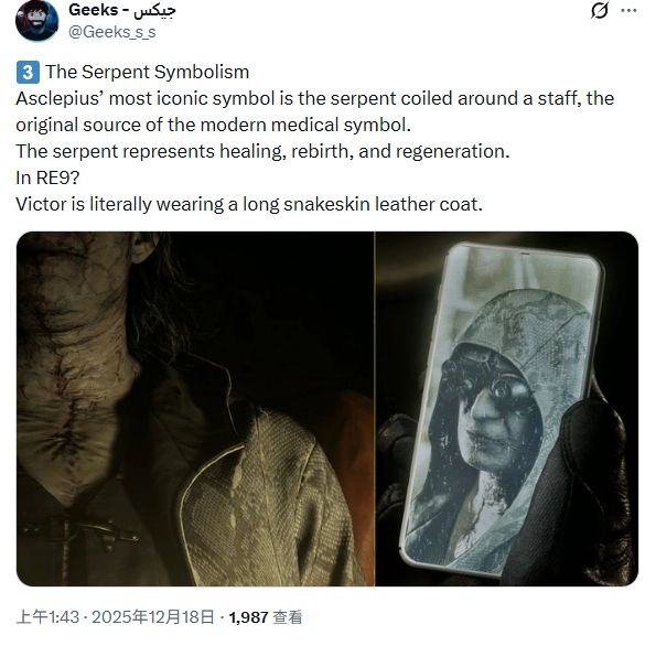 第三点,阿斯克勒庇俄斯最具标志性的象征是缠绕在手杖上的蛇,这也是现代医学标志的起源。蛇象征着治愈、重生与再生。在《生化危机9》中呢?维克多·基甸实际上穿着一件长款蛇皮皮衣。