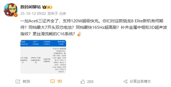 数码博主“数码闲聊站”表示,一加Ace6已三证齐全,意味着符合上市条件,只差一个发布会就能上市发售。