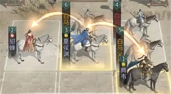 1、夏侯渊天赋技能在追击触发时概率发动,需将其放置在貂蝉、典韦的追击格上,故采用图示站位。