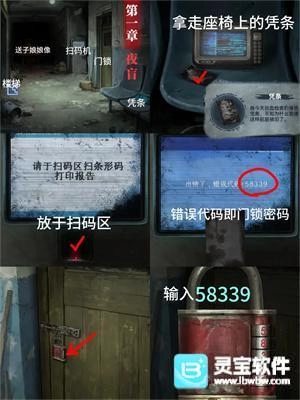 1、在右侧的椅子上找到【凭条】,点击自助服务机并扫描该凭条,获取数字【58339】,用这个数字打开右侧的房间门