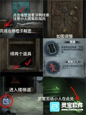 3、回走廊触发盲老太,点左边上楼标识将【剪纸小人】放在安全出口上,上楼