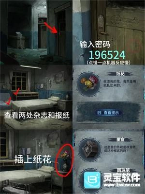 7、进入二楼病房点击沙发上的书和桌上的报纸触发婴儿病床得到【纸花】,插进花瓶,得到【墨盒】【圆珠笔】
