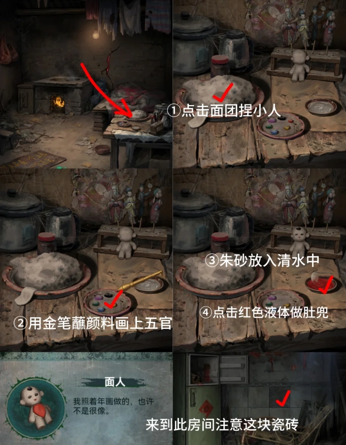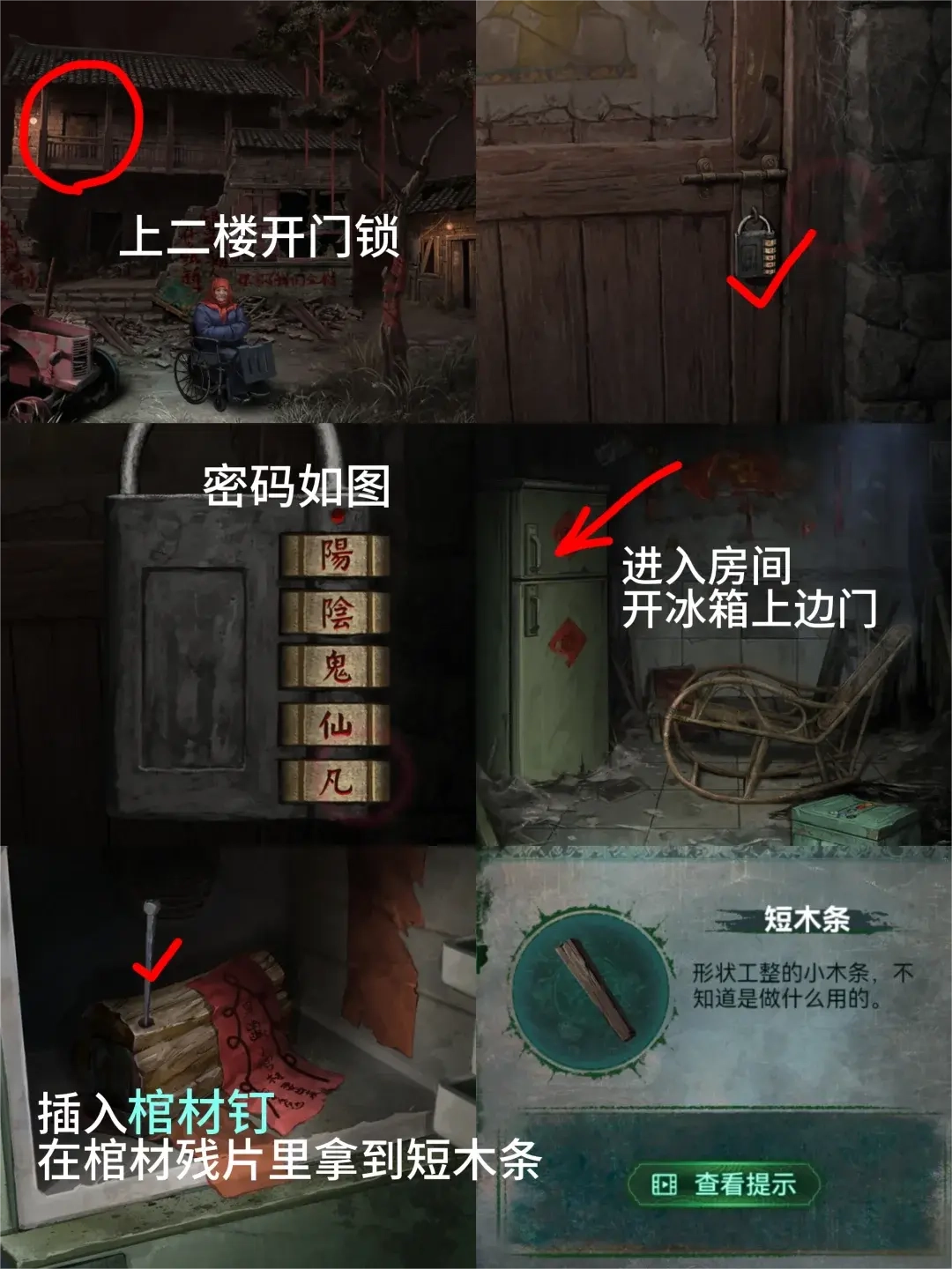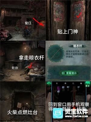 3、回村点右侧房门贴上【门神】开门,进屋拿到【晾衣杆】,【火柴】点燃灶台,用手机照商店窗口得到拉风箱顺序【1321】,【晾衣杆】将灶台上方娃娃打下来(微恐),得到【石片】、【棺材钉】