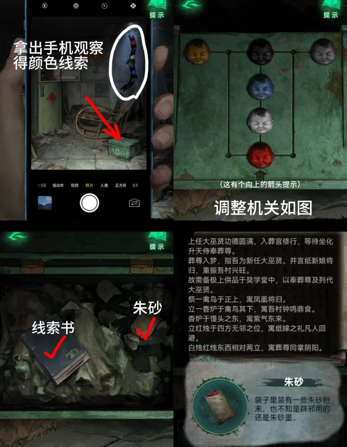 7、进屋点开冰箱将【棺材钉】插进棺材小孔得到【短木条】,手机照屋内得到小孩颜色提示,点摇椅旁盒子从上到下顺序为【黑蓝白红】得到【账本】、【朱砂】