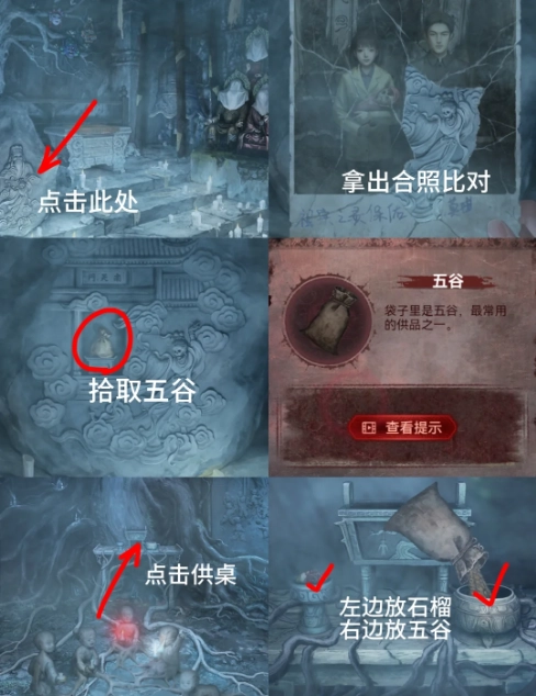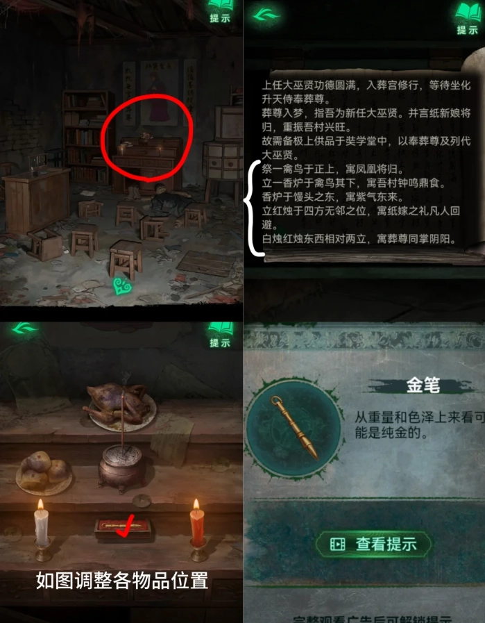 8、回村口屋子根据【账本】提示摆放供桌物品【最上排:空、鸡、空】【第二排:馒头、香炉、空】【最下排:白烛、空、红烛】得到【金笔】